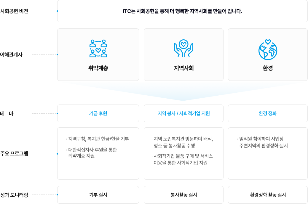 ITC는 더 행복한 지역사회를 만들기 위한 사회공헌 활동을 적극적으로 실천하고 있습니다.